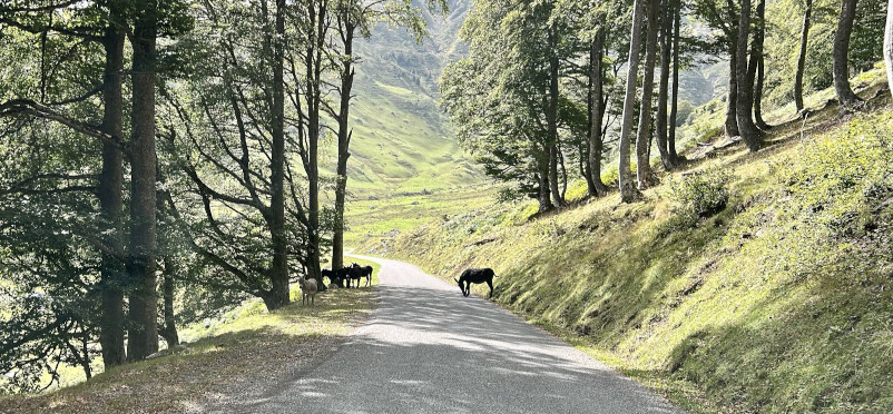 La départementale D113 jusqu’au Col Hourquette d’Ancizan est d’une incroyable diversité. C’est une superbe route, à travers une foret de sapin. Aux détours d’un virage, je découvre des ânes ! La route quitte le foret pour une belle montée jusqu’au Col d’Houquette d’Ancizan. Le lieu est connu, beaucoup de Cyclistes. Une vue sur la vallée, encore une fois, superbe !