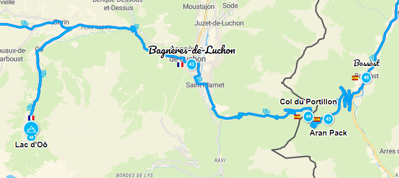 De retour, je prends la route pour la plus longue distance, en deux étapes, de mon voyage. Celui-ci passe par Bagnères-de-Luchon, une station thermale et de ski l’hiver. La D618a rejoint l’Espagne par le Col du Portalet frontière entre les deux pays.