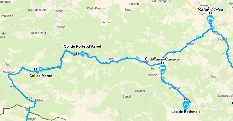 Je retrouve rapidement la France, direction Castillon-en-Couserans, par le col de Menté et celui de Portet-d’Aspet. La route de montagne en lacet est interminable… peu de monde. Le paysage change. L’Ariège est d’une beauté incroyable. Je passe la nuit au camping de Castillon-en-Couserans.