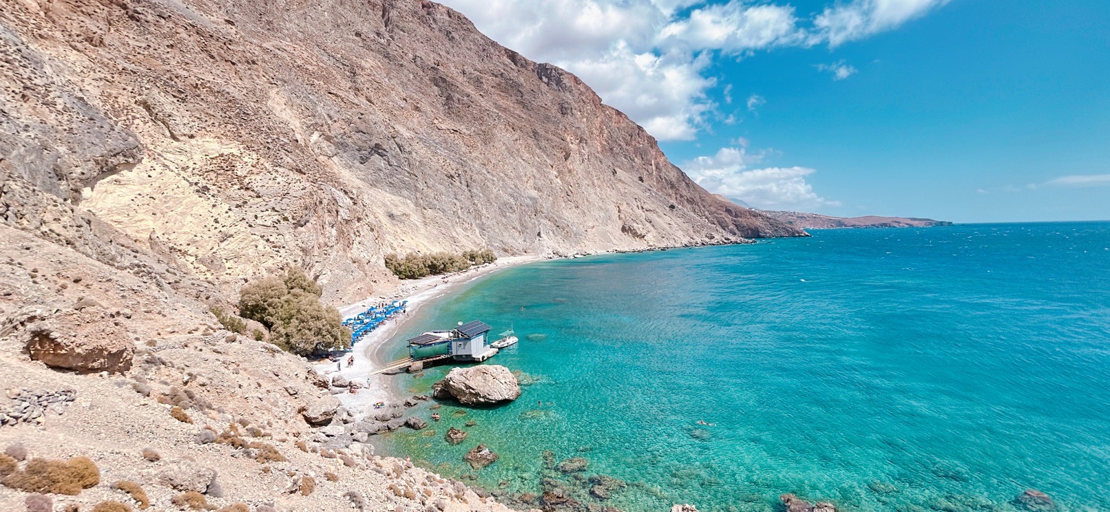 Le lendemain matin, le soleil est déjà bien présent à 7h30, je pars en randonnée le long de la côte. Après 20 minutes sur la route, un sentier côtier mène au village de Loutro. Le village est accessible uniquement à pied ou par la mer. Celui-ci est un peu raide, étroit et proche du vide à certains endroits. Certains passages exigent un pied sûr et/ou exposés au vide. Des cordes métalliques sont là pour aider !